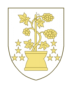 Une cuve d’où sort un cep de vigne fruité de trois pièces, sur un échalas, la cuve accostée de chaque côté de quatre étoiles posées 1 – 1 – 2.