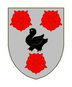 D’argent à la merlette de sable, accompagnée de trois roses de gueules.