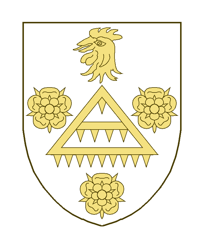 Une herse triangulaire surmontée d’une tête de coq arrachée, et accompagnée de trois roses, deux aux flancs, une en pointe.