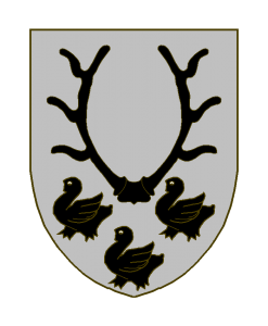 D’argent au massacre de cerf de sable, accompagné de trois merlettes du même, posées en pointe, 2-1.