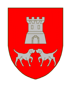 De gueules à une tour d’argent, accompagnée en pointe de deux chiens passants du même, affrontés.