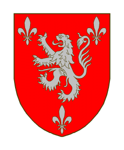 D’argent au lion de gueules accompagné de trois fleurs de lis du même.
