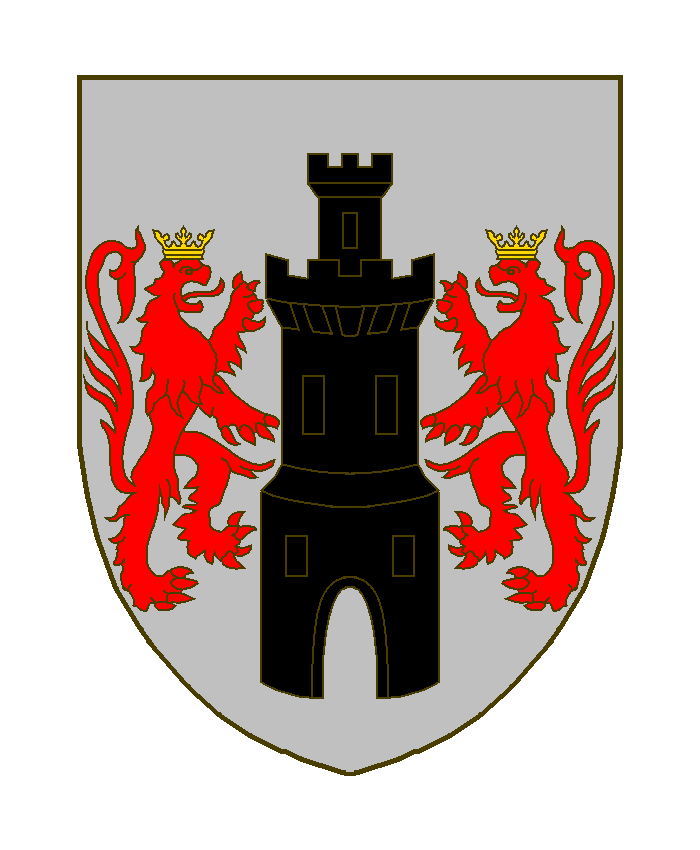D’argent à la tour ronde de sable, ouverte, et sommée d’une lanterne du même, accostée de deux lions affrontés de gueules, couronnés d’or.