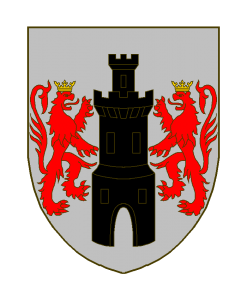 D’argent à la tour ronde de sable, ouverte, et sommée d’une lanterne du même, accostée de deux lions affrontés de gueules, couronnés d’or.