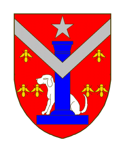 De gueules à une colonne d’azur soutenue d’un socle du même, et à un chien assis sur le socle, derrière la colonne, le tout accosté à dextre et à sénestre de trois abeilles mal ordonnées d’or et surmonté d’une étoile d’argent, au chevron renversé d’argent mouvant du chef et brochant sur la colonne.
