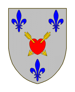D’argent au coeur de gueules percé de deux flèches d’or en sautoir, et accompagné de trois fleurs de lis d’azur, deux en chef (ou aux flancs), une en pointe.
