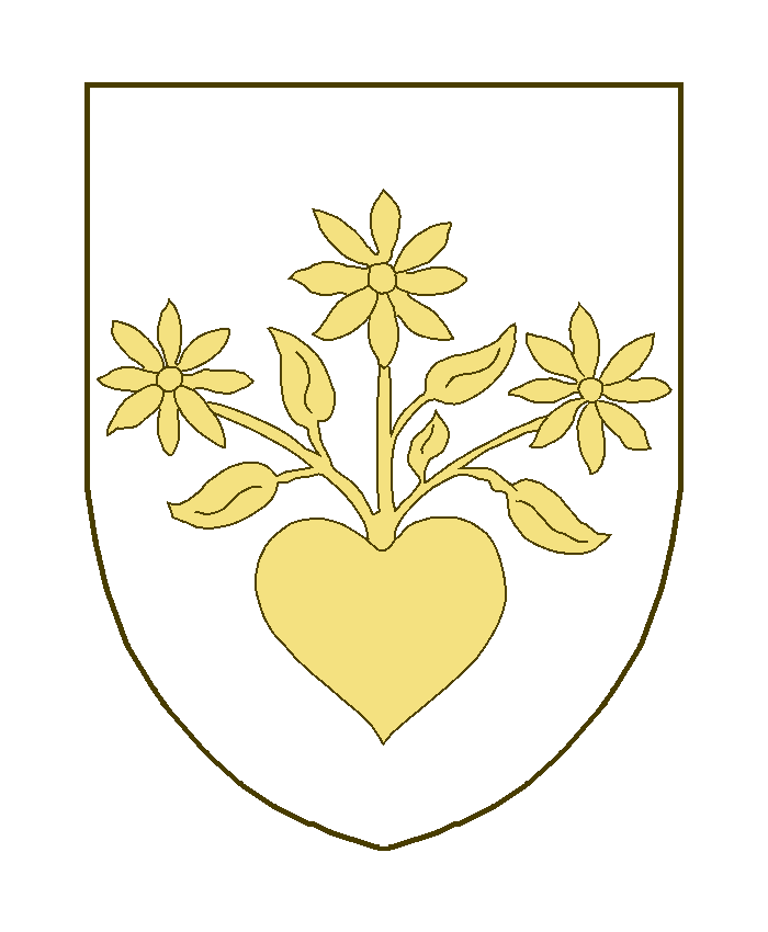 Un coeur, de la boucle duquel issent trois fleurs à huit pétales, tigées et feuillées.
