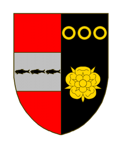 Parti au I de gueules à la fasce d’argent chargé de trois poissons de sable (Le Brum) au II de sable à la rose d’or accompagnée de trois annelets d’or, rangés en chef (Monflin).Cimier: