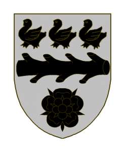 D’argent au chicot en fasce de sable, accompagné en chef de trois merlettes du même, en pointe d’une rose du même (Le dessin montre une fasce en chicot).