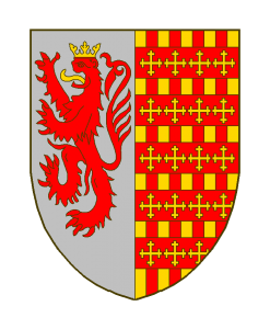 Parti au I d’argent au lion de gueules, lampassé et couronné d’or, au II d’argent à quatre pals de gueules, et quatre fasces du même brochant, chacune chargé de quatre croisettes recroisettées d’or.