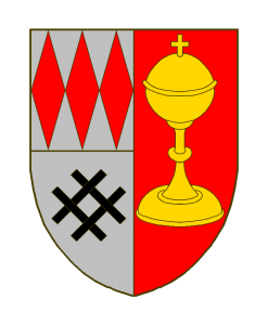 Parti au I coupé d’argent à trois fusées d’argent, et d’argent à la frette de sable; au II de gueules au calice couvert d’or.