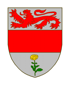 d’argent à la fasce de gueules surmontée d’un lion passant du même, accompagnée en pointe d’une fleur de souci d’or, tigée et feuillée de sinople