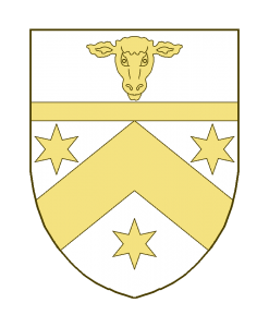 Un chevron accompagné de trois étoiles à six rais, au chef séparé par une divise, et chargé d’un rencontre de veau.