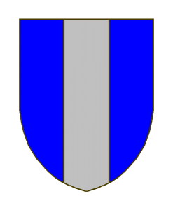 Une tête et col de lévrier d’argent, langué de gueules entre un vol d’azur chaque aile chargé de sept feuilles de tilleul d’argent posées 2-2-2-1.