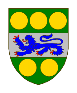 De sinople à la fasce d’argent, chargé d’un lion passant d’azur, armé et lampassé de gueules, et accompagnée de cinq besants d’or, trois en chef, deux en pointe.