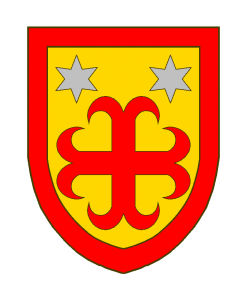 D’or à la croix ancrée de gueules, accompagnée en chef de deux étoiles à six rais (dites molette par B. ) d’argent, à la bordure de gueules.