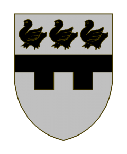 D’argent à la fasce bastillé de deux pièces de sable, accompagnée en chef de trois merlettes du même.
