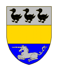 Coupé, en chef d’argent à trois canettes de sable, en pointe d’azur à une licorne couchée d’argent, à la fasce d’or brochant sur le coupé.