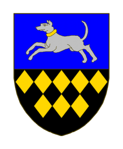 Coupé, au chef d’azur au lévrier d’argent, colleté d’or, en pointe de sable à huit losanges aboutées d’or, 5-3 (ou Losangé de sable et d’or).