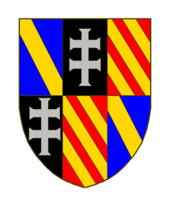 Coupé d’un trait, parti de deux, qui font six quartiers: aux I et VI d’azur à la bande d’or, aux II et IV de sable à la croix de Lorraine pattée d’argent, aux II et V de gueules à trois bandes d’or.
