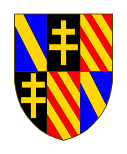 Coupé d’un trait, parti de deux, qui font six quartiers: aux I et VI d’azur à la bande d’or, aux II et IV de sable à la croix de Lorraine d’or, aux II et V de gueules à trois bandes d’or. (douteux).