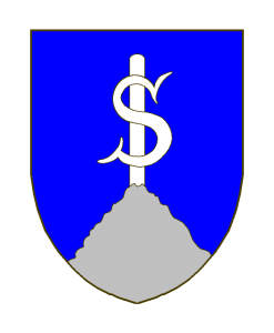 D’azur à un mont pointu d’argent, sommé d’un bâton en pal sur lequel broche une lettre S majuscule.