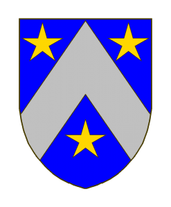 D’azur au chevron d’argent accompagné de trois étoiles d’or, posées 2 et 1.