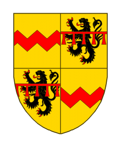 Écartelé, aux I et IV d’or à la fasce vivrée de gueules, aux II et III d’or au lion de sable, armé et lampassé de gueules, au lambel à cinq pendants du même brochant, qui est Blankenheim.