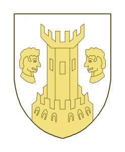 Une tour crénelée issant d’une enceinte crénelée, mouvant de la pointe, accostée de deux têtes d’homme affronté es.