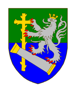 Coupé cousu de sinople et d’azur, au lion d’argent, armé et lampassé de gueules, couronné d’or, soutenant des pattes de devant une croix haute écotée d’or, et reposant avec les pattes de derrière sur une colonne d’argent à chapiteau et base d’or, posée en bande au second, et croisant en sautoir le pied de la croix.