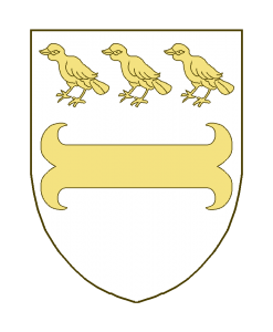 Une ancre de maçonnerie posée en fasce, accompagnée en chef de trois oiseaux.