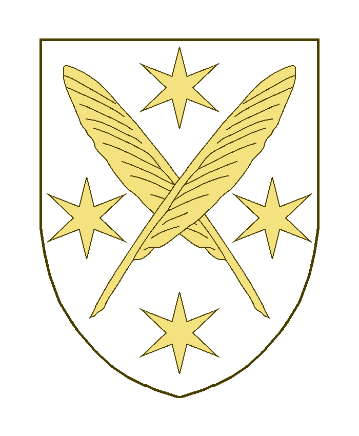 Deux plumes à écrire en sautoir, les pointes en bas, cantonnées de quatre étoiles à six rais.