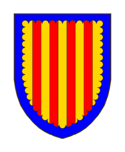 Deux griffons d’or, chacun ayant une aile de gueules, et tenant une bannière. celle à dextre d’or à quatre pals de gueules, celle à sénestre aux armes.