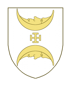 Une croisette potencée en abîme accompagnée de deux croissants figurés, l’un en chef les cornes en haut, l’autre en pointe, les cornes en bas.
