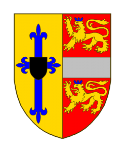 Parti, à dextre d’or à la croix florencée d’azur chargé d’un écusson de sable, à sénestre de gueules à la fasce d’argent accompagnée de deux lions léopardés d’or, couronnés d’azur.