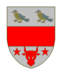 D’argent à la fasce de gueules sur laquelle passent deux mésanges au naturel (en chef), accompagnée en pointe d’un rencontre de boeuf accorné de gueules, accosté de deux étoiles du même.