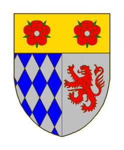 Parti losangé d’argent et d’azur, et d’argent au lion rampant de gueules, au chef brochant d’or, chargé de deux roses de gueules, boutonnées d’argent, feuillées de sinople.