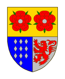 Coupé, mi-parti vers la pointe, au I d’or à deux roses de gueules boutonnées d’argent et feuillées de sinople posées en fasce ; au II d’azur à dix losanges d’argent rangés en pal, 3-4-3; au III d’argent au lion rampant de gueules.