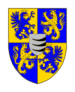 - Un griffon d’azur portant sur la tête le globe écartelé d’argent et de gueules, sommé de cinq plumes d’autruche, alternativement d’argent et de sable, entre deux proboscides écartelés d’argent et de sable.