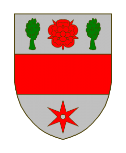 D’argent à la fasce de gueules, accompagnée en chef d’une rose de gueules entre deux arbres de sinople, en pointe d’une molette de gueules.