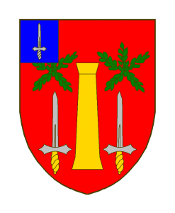 De gueules à la colonne d’or adextrée et sénestrée d’une épée haute en pal d’argent, montée d’or, chacune des épées surmontée d’un bouquet de cinq branches de laurier de sinople formant étoile. franc-quartier des comtes militaires (D’azur à l’épée haute d’argent) brochant au 9e de écu (patentes de comte).