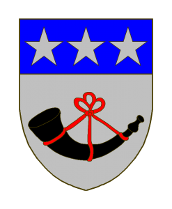 D’argent à la trompe (sic) de sable suspendue à un ruban de gueules noué en lacs, au chef d’azur à trois étoiles d’argent posées en fasce.