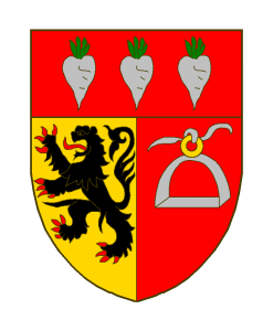 Parti d’or (ou d’argent) au lion de sable, armé et lampassé de gueules et de gueules à l’étrier d’argent lié du même (la boucle d’or); au chef de gueules à trois navets d’argent feuillés de sinople rangés en fasce.