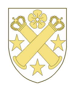 Deux colonnes surmontées, de couronnes princières, en sautoir, accompagnées en chef d’une quintefeuille, aux flancs et en pointe d’une étoile.