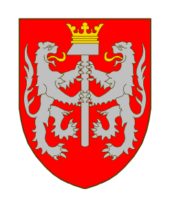 De gueules à deux lions affrontés d’argent, lampassés (et couronnés) d’or, tenant de leurs pattes un marteau d’argent en pal, couronné d’or.