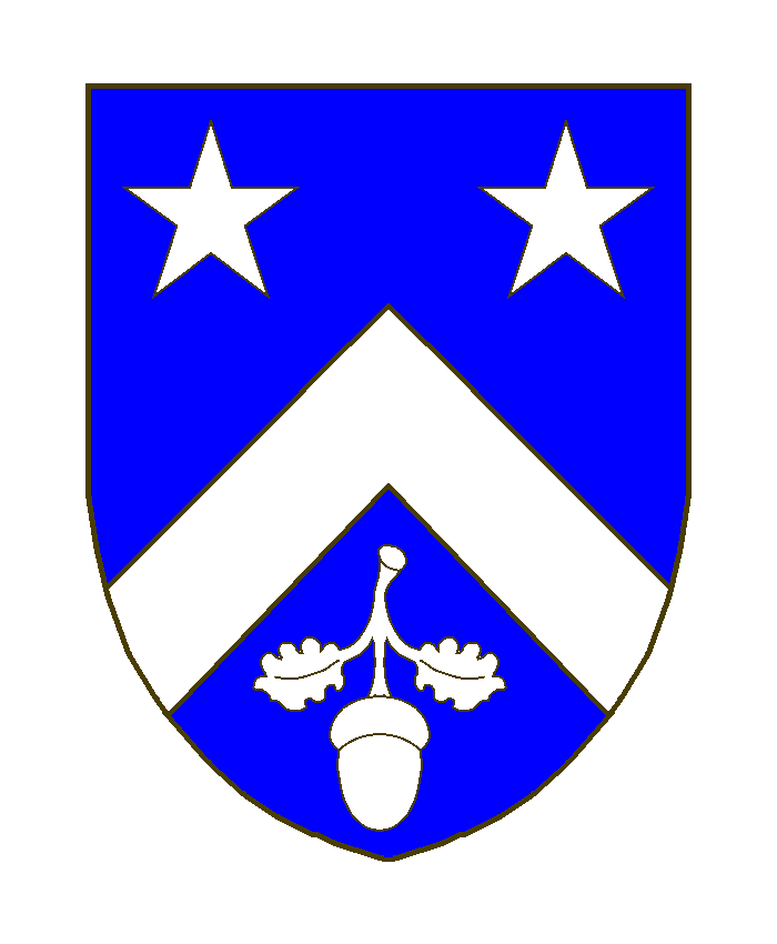 D’azur au chevron, accompagné en chef de deux étoiles, en pointe d’un gland tigée t feuillé, la queue en haut.