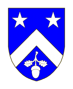D’azur au chevron, accompagné en chef de deux étoiles, en pointe d’un gland tigée t feuillé, la queue en haut.