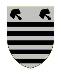 D’argent à cinq burelles de sable, accompagnées en chef de deux maillets couchés de sable, la manche à sénestre.
