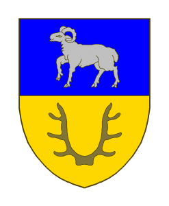 Coupé, en chef d’azur au mouton passant d’argent, en pointe d’or au massacre de cerf au naturel.