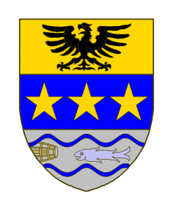 Tiercé en fasce: au I d’or à l’aigle de sable, au II d’azur à trois étoiles d’or, au III d’argent à deux fasces ondées d’azur, entre lesquelles un poisson nage au naturel, la tête engagée dans un ret au naturel, mouvant du flanc dextre.
